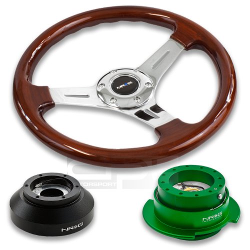 NRG-SRK-E30H+0151CH+250GN, NRG Innovations 13" 330mm Deep Dish Style Wood Grain Silver Spokes Racing Steering Wheel Combo with 6 Hole Short Hub Adapter with Gen 2.5 Green Quick Release Kit SRK-E30H?NRG Quick Release features many options that conventional ball-locking quick release system do not. It is specially engineered with raised sections to prevent the scratching and stretching of the hub while a self locking feature adds increased safety and functionality. Features racing styled for added style and look. Each unit is made from the highest quality aircraft grade aluminum and is anodized for maximum durability and finish.